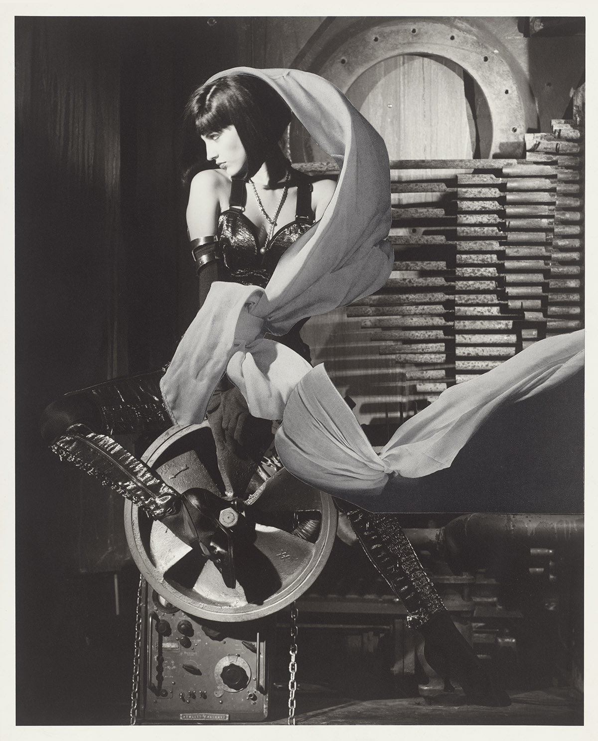 Branson’s photography is renowned for blending the drama and elegance of 1930s Hollywood with the vibrancy of 1980s Los Angeles nightlife. At the heart of the city’s cultural scene, his studio famously transformed into Power Tools, one of the hottest nightclubs frequented by actors, musicians, and artists after dark. Branson and Dutch artist Kok began collaborating under the name Indüstria after Branson saw some of Kok’s futuristic paintings. Together, they pioneered a new aesthetic, blending photography, graphic design and collage.