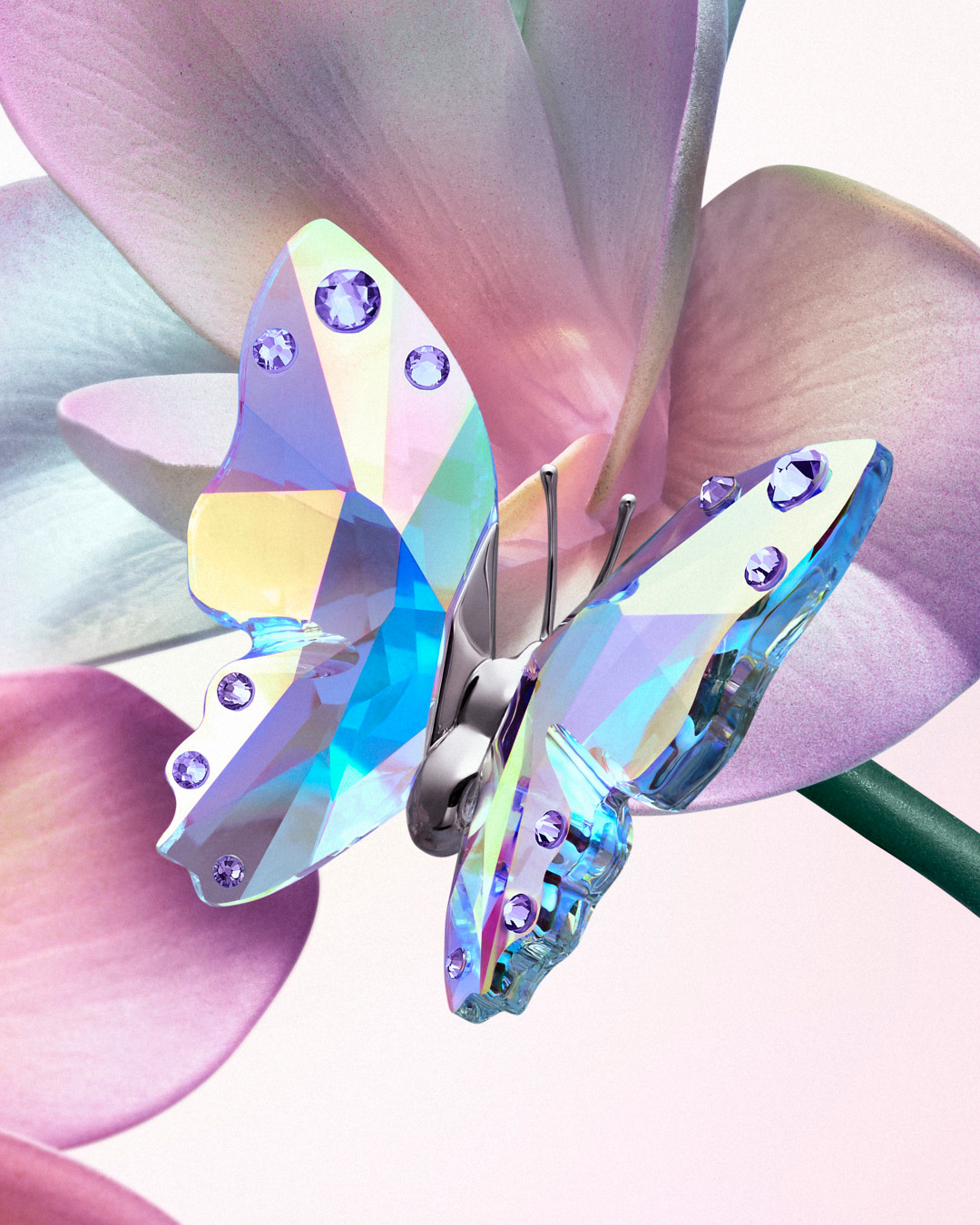 Literal and abstract interpretations of dragonflies and flowers unite in a glittering celebration of nature’s magic. Rainbow-hued stones and delicate crystal pearls embellish jewelry in an array of cuts and mixed-metal settings, while crystal butterflies adorn brooches, hair accessories, and figurines.