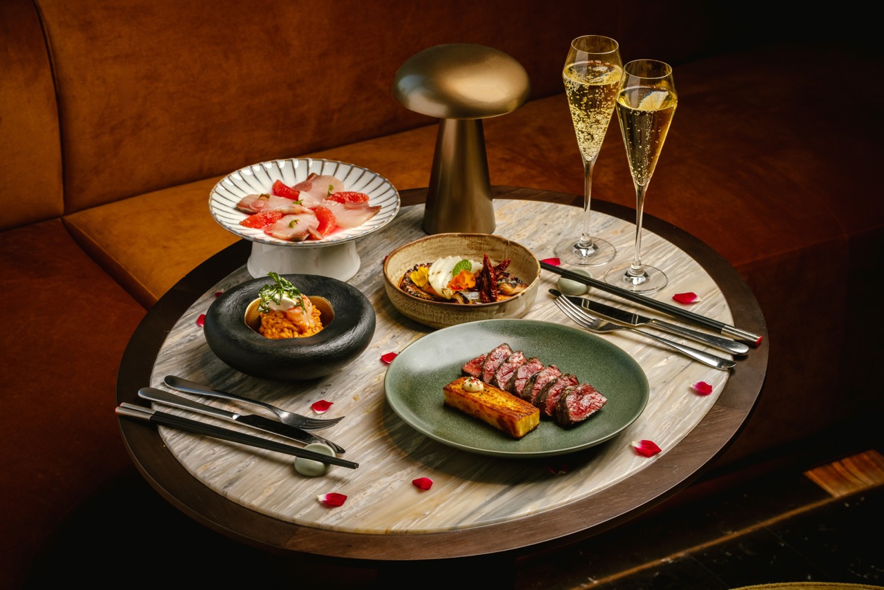 At Hillside, lovers are treated to a five-course dinner set menu (HK$988) with a complimentary glass of Perrier Jouët Grand Brut NV Champagne, the ultimate toast to love and togetherness. The evening begins with the Kagoshima Hamachi Crudo, where lime zest and blood orange jus brighten each delicate slice, elevated by the aromatic depth of shallot oil. Entrées follow with both the beautifully charred Grilled Spanish Octopus with smoky romesco sauce and the Lobster Risotto, enriched with silky mascarpone and fragrant lobster dashi. The Hillside Charcoal Grilled Striploin arrives perfectly seared and brushed with a lustrous black cherry gastrique, a sublime balance of savory and sweet. For the grand finale, the Citrus Tart with toasted meringue provides a refreshing burst of sunshine to end on a bright note.