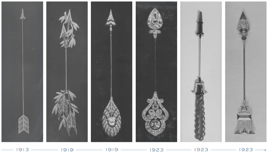 The arrow has lent itself to a variety of aesthetics down the years: on some, the feathers became those of a peacock – another highly prized Boucheron motif – while other arrows appear to have caught on some foliage along the way. Influences from different artistic trends can also be felt, such as modern Orientalism, which saw arrows adorned with Egyptian motifs. In the 1920s the arrow became more stylized, embracing the codes of Art Deco and incorporating its signature materials like jade.