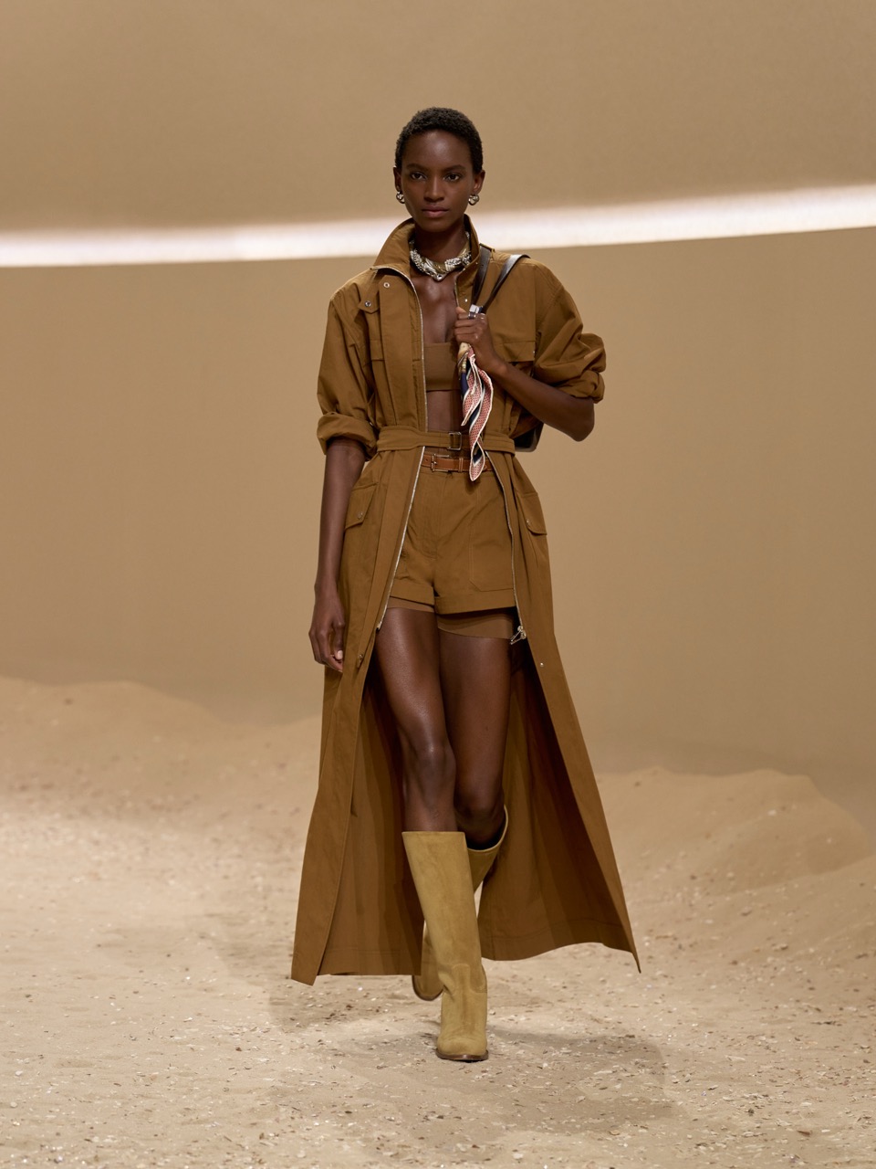 Curved forms accented with hand-waxed leather, straps, buckles and rings combine utility with the artisanal, as quilting nods to leatherworking skills and the ancestral craft of boutis needlework. Designed for movement, a cropped equestrian jacket pairs with an asymmetrical skirt in quilted linen canvas, while billowing dust coats inspired by the trench are cinched with harness belts, reflecting both tailoring codes and equestrian precision.