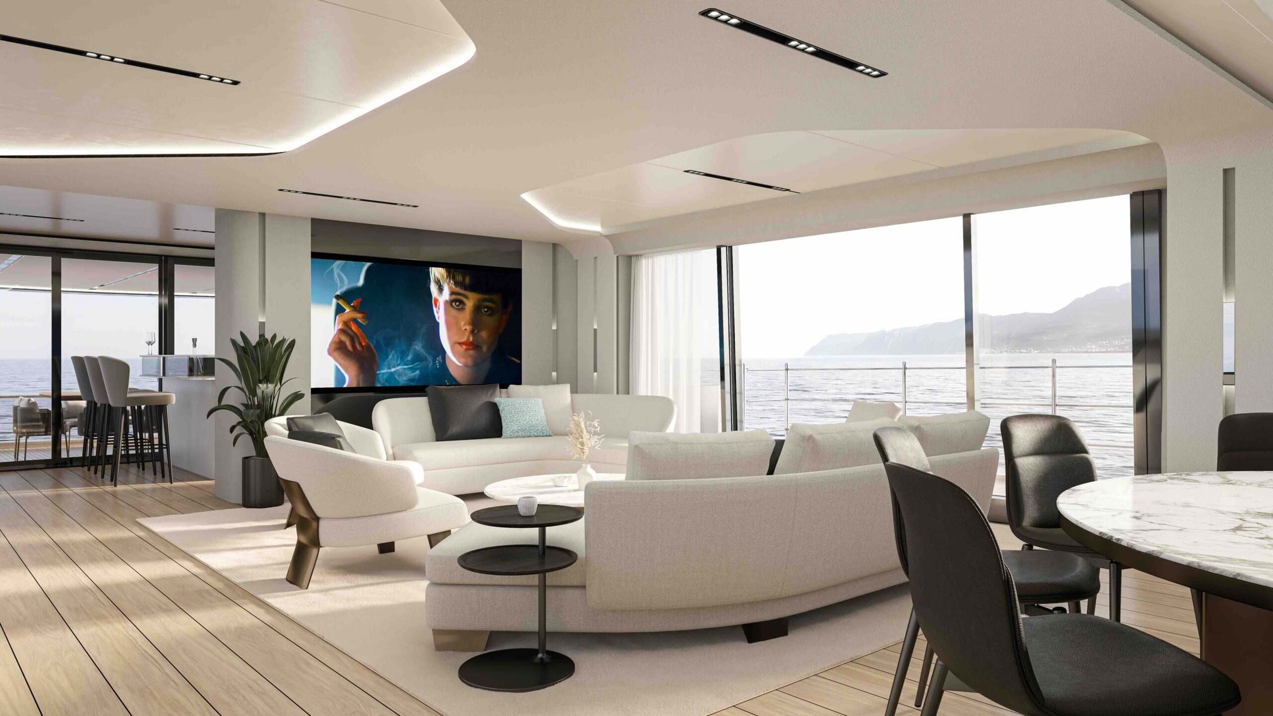 Interiors open with a second bar leading into the main saloon, flooded with natural light thanks to large floor-to-ceiling opening windows. Semi-circular sofas, armchairs, and a round table for ten guests define an elegant, fluid, and strongly contemporary setting.
