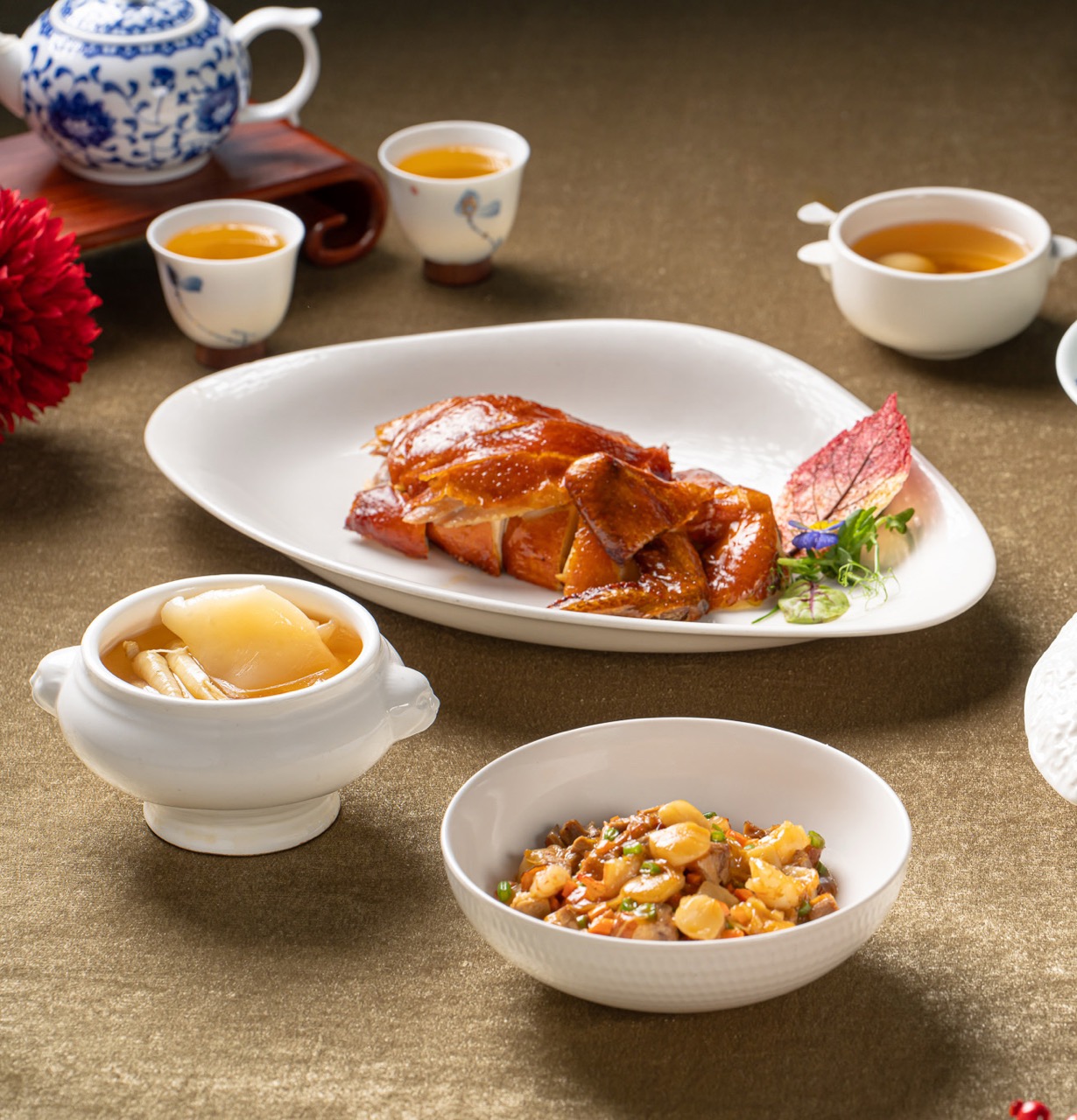 • Highlights: Double-boiled Pigeon Soup with Fish Maw & Fresh Ginseng; Deep-fried Crispy Chicken; Honey-glazed Barbecued Pork; Braised Japanese Sea Cucumber with King Oyster Mushroom in Yunnan Ham Sauce; Steamed Giant Grouper