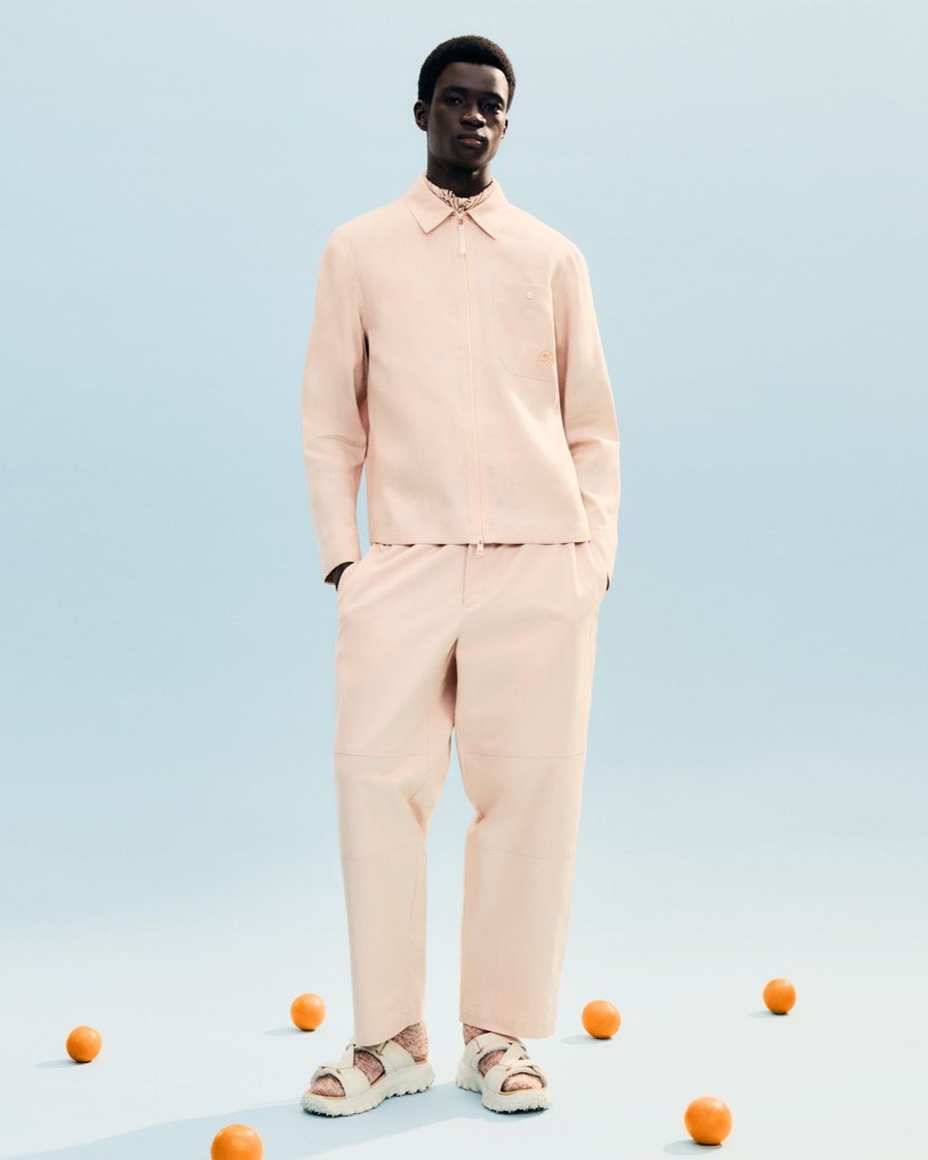 Crafted for summer wanderings, the collection seamlessly blends technical excellence and relaxed design. Cloudlike down jackets and quilted vests nod to Moncler’s mountain roots, layered over workwear silhouettes and utilitarian shorts. Fabrics like technical linen canvas, cotton, and cashmere blends deliver breathability with earthy texture. Colors—sun-washed pinks, soft creams, and citrus tones—evoke golden hours among Gilga’s orange groves.