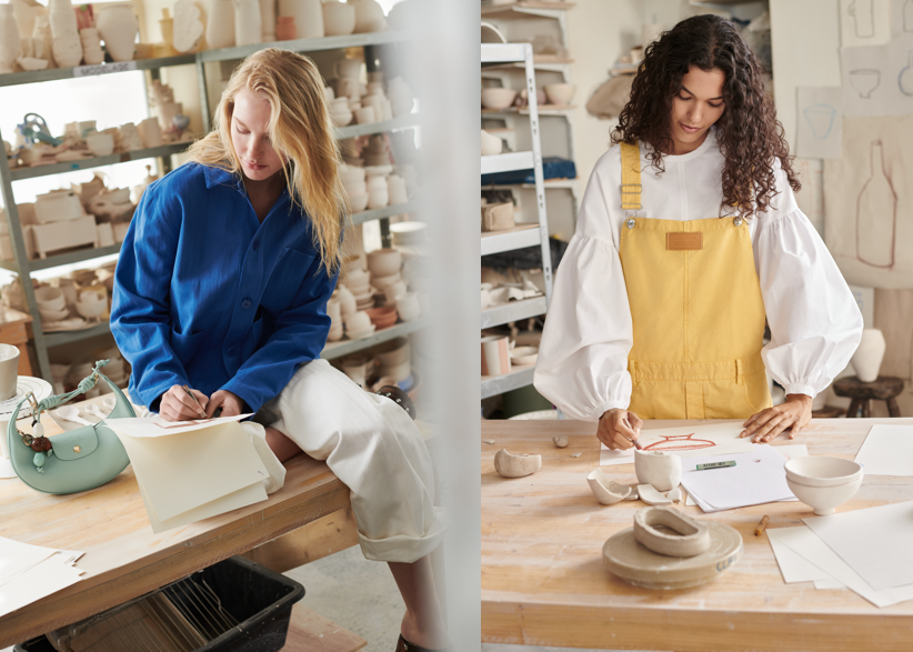 In her Paris atelier, the ceramist is totally wrapped up in her work. She rolls up her sleeves to keep her hands free. Modeling, controlling the wheel, glazing… Her artisanal savoir-faire influences her style as she shapes the clay in her scalloped painter’s smock. Her designs are like her wardrobe: organic, irregular, authentic. Like the charms she hangs from her Le Pliage Collection artist’s basket or her new Le Pliage Xtra half-moon bag. As for the ornamental lines on her ceramics, they echo the crochet details of her Le Pliage Filet bag. The calm atmosphere of her atelier-hideaway influences the natural hues of her clothes — ecru, paper, earth, mahogany and ebony.