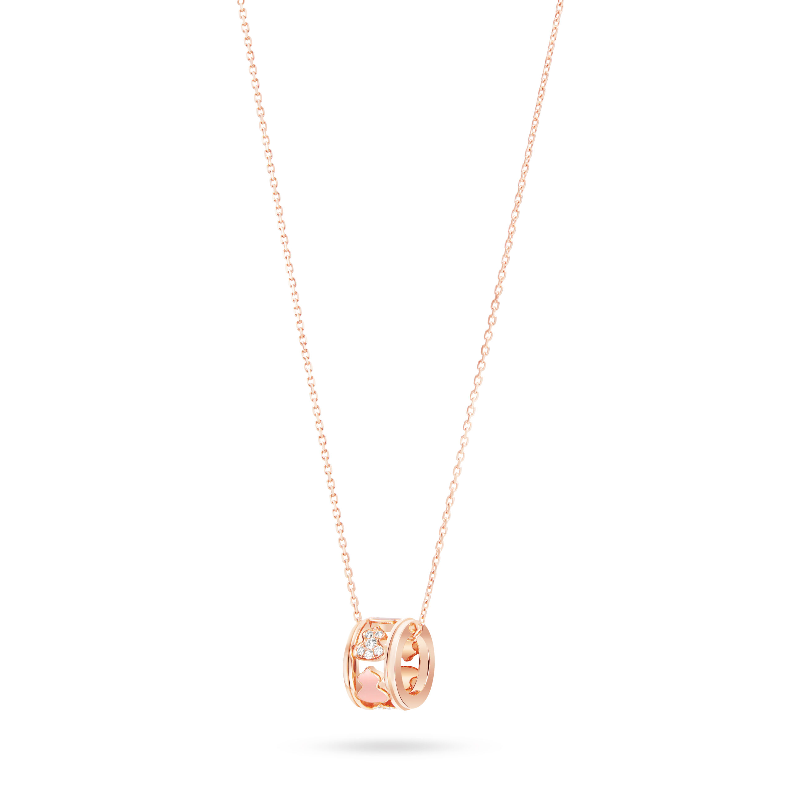 The pendant features six vertically aligned three-dimensional Wulu motifs, each meticulously sculpted with crisp contours. Brilliant diamonds are paired with Qeelin’s exclusive pink HyCeram® ceramic—this is a modern statement crafted especially for the festival. While diamonds speak of eternity, the pink ceramic adds a fresh, contemporary touch. The 18K rose gold chain, cut with diamond-like precision, shimmers with a galaxy-like glow, radiating both luck and sweetness.
