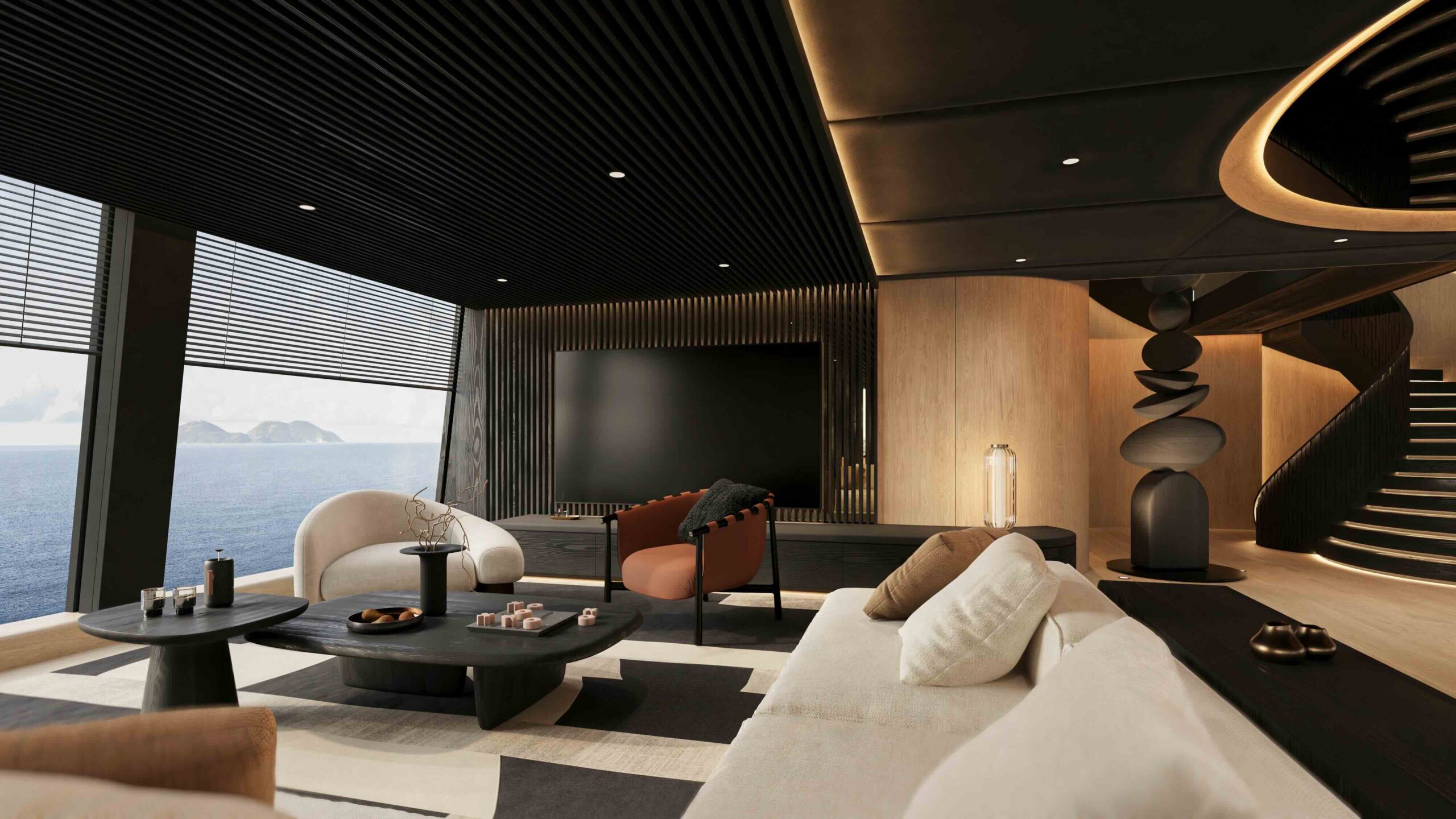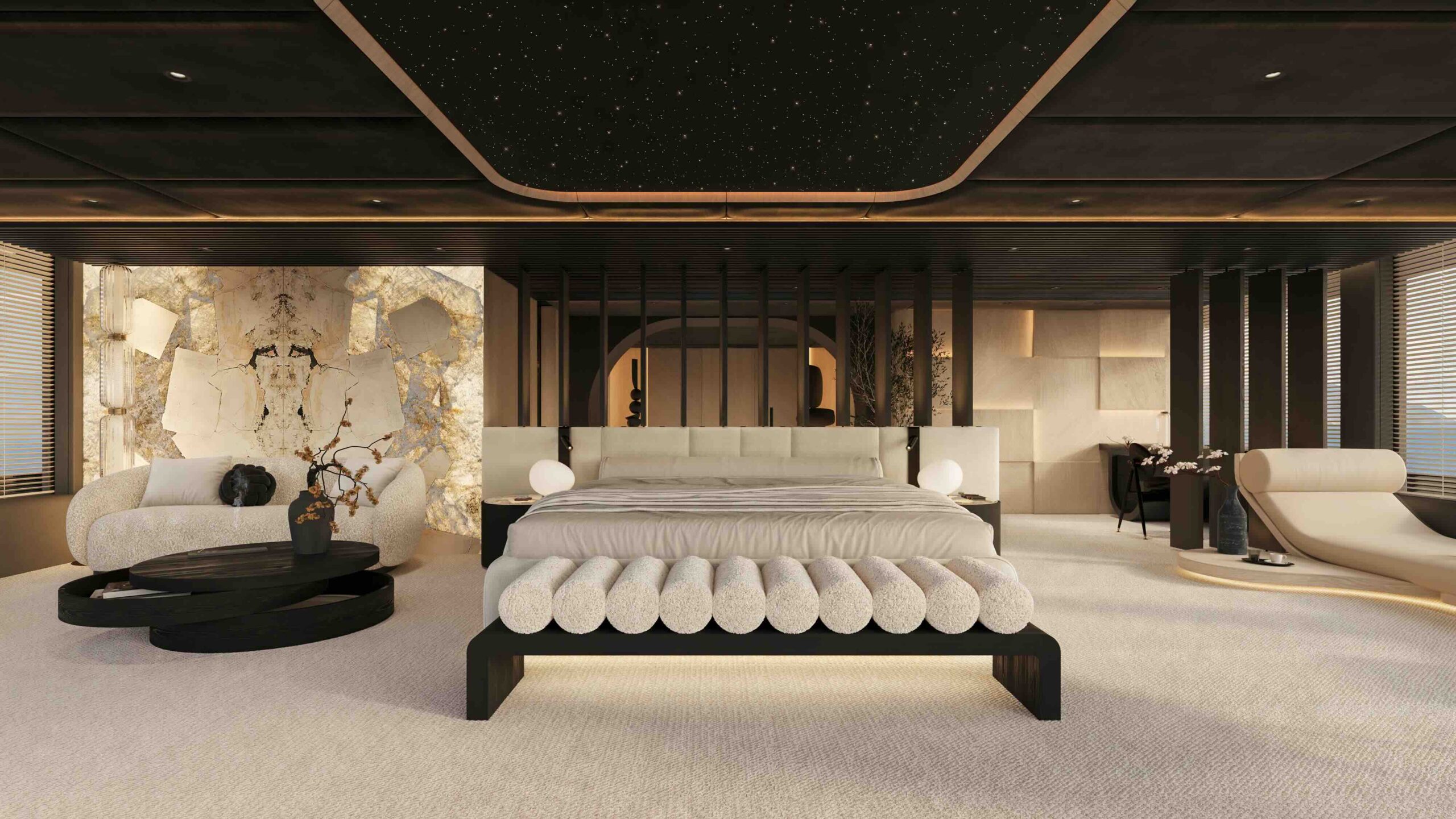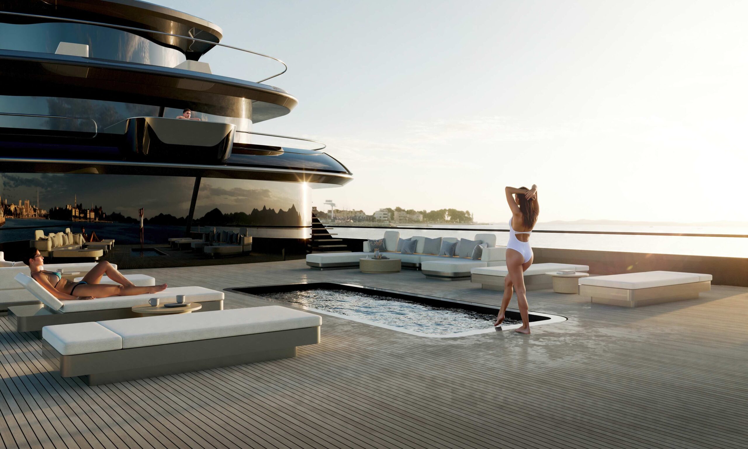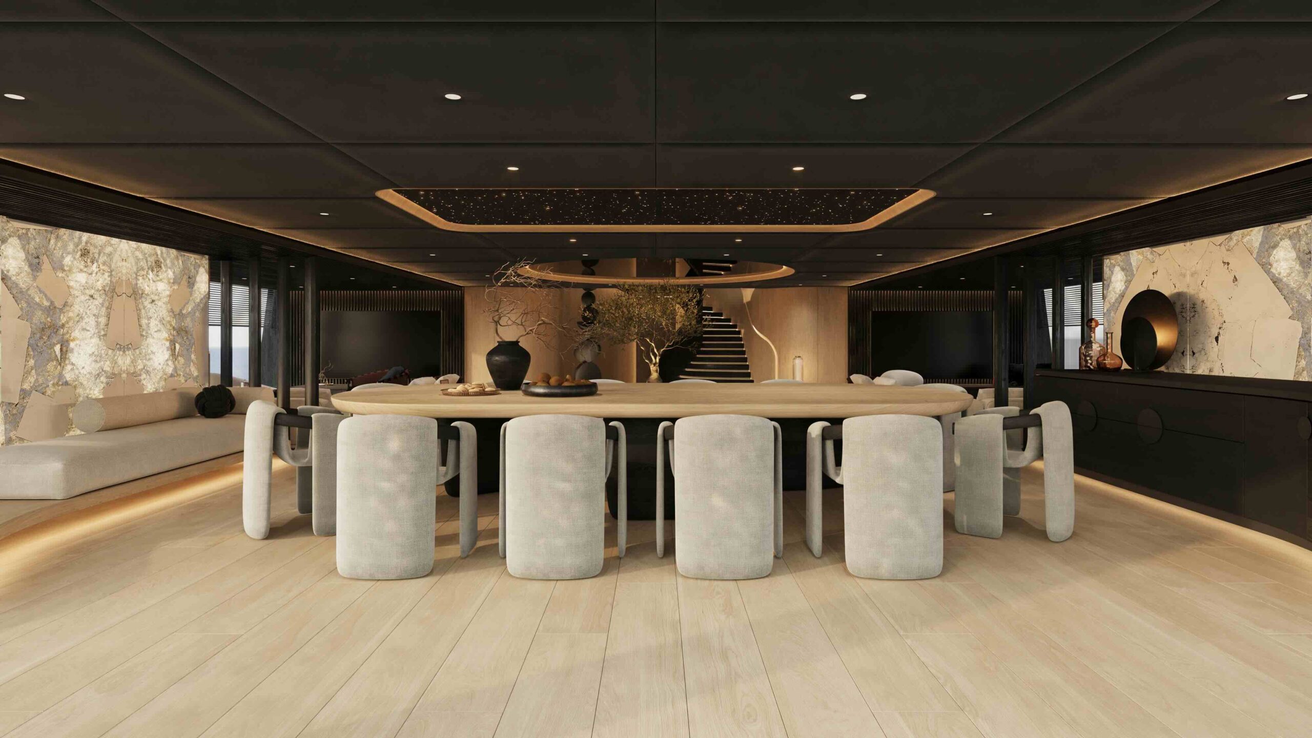 Social spaces include formal and informal dining areas, panoramic lounges, a moon-shaped bar on the bridge deck, and extensive sun terraces. A 6m aft pool and Jacuzzi deck highlight the yacht’s outdoor lifestyle, perfect for entertaining or relaxation.