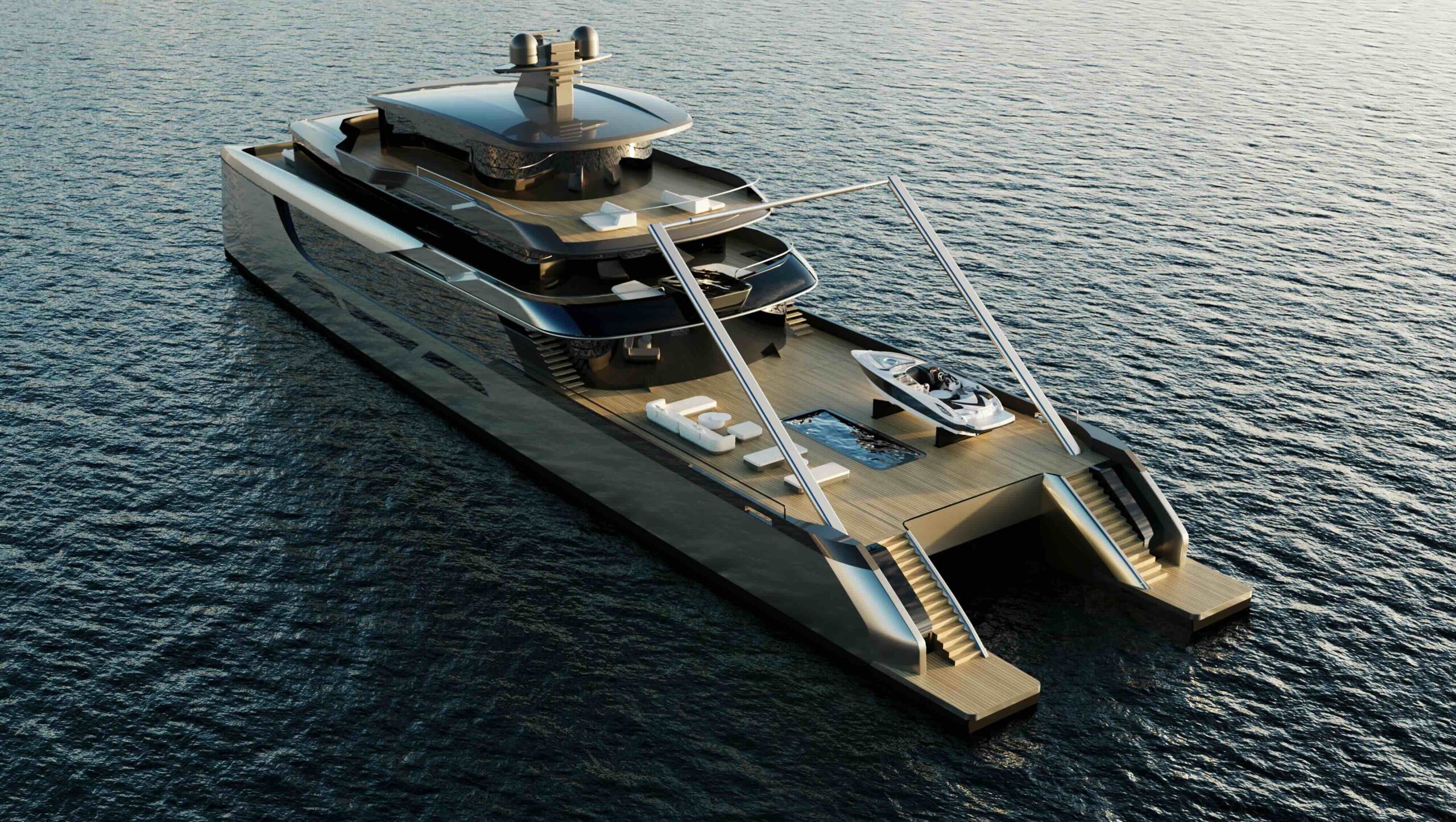 The catamaran hull design truly shines in the vast aft beach club. Steps lead down from the pool area to the yacht’s skirts, which can be combined to create a huge waterside gallery when the platform is lowered. There is room for a 7m tender and multiple jetskis, or the space can be transformed into a beach club with deck furniture and a parasol right at the water’s edge.