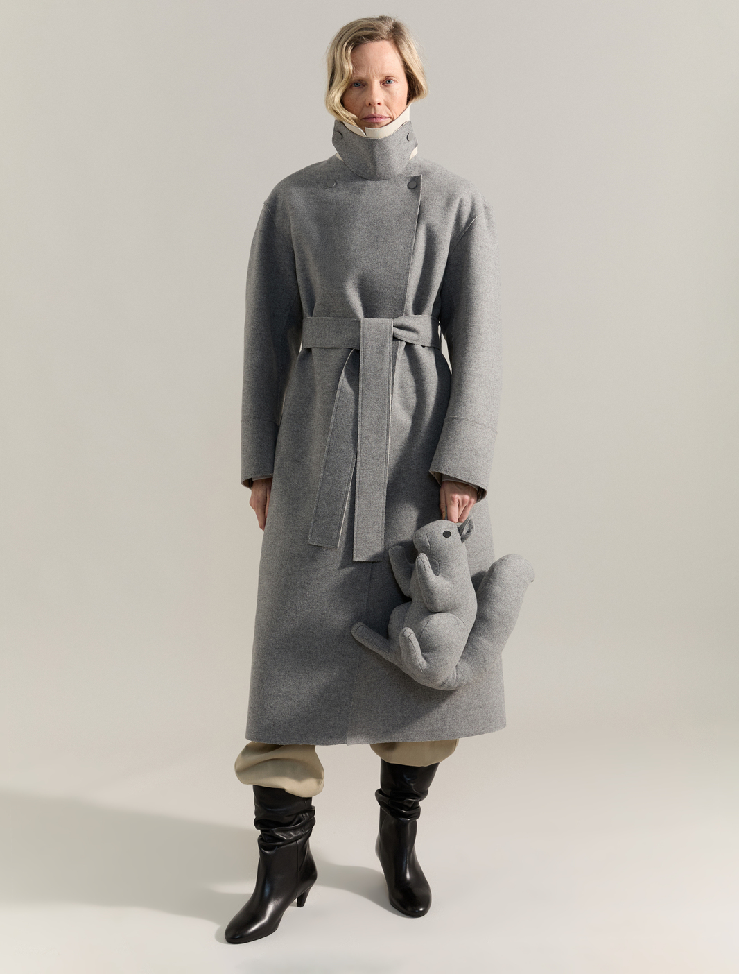 SNAP. PACK. DEPLOY. rounds out with a pragmatic and playful accessory offering. A drawstring knit balaclava, arm warmers, beanie and hooded vest, are designed to be easily layered, aligning with the collection’s versatility. Bags, too, echo the utilitarian mood. A maxi tote and a padded waxed nylon backpack with laptop pocket in the water-repellent ripstop resonate with the collection’s explorative attitude. SNAP. PACK. DEPLOY’s solo footwear proposition – a slouched, ruched boot with grosgrain tape accents – adds a touch of unpredicted femininity. The collection rounds off with a piece of playful merch, a squirrel, a mascot which speaks to a levity at the heart of both RÆBURN and MAX&Co.