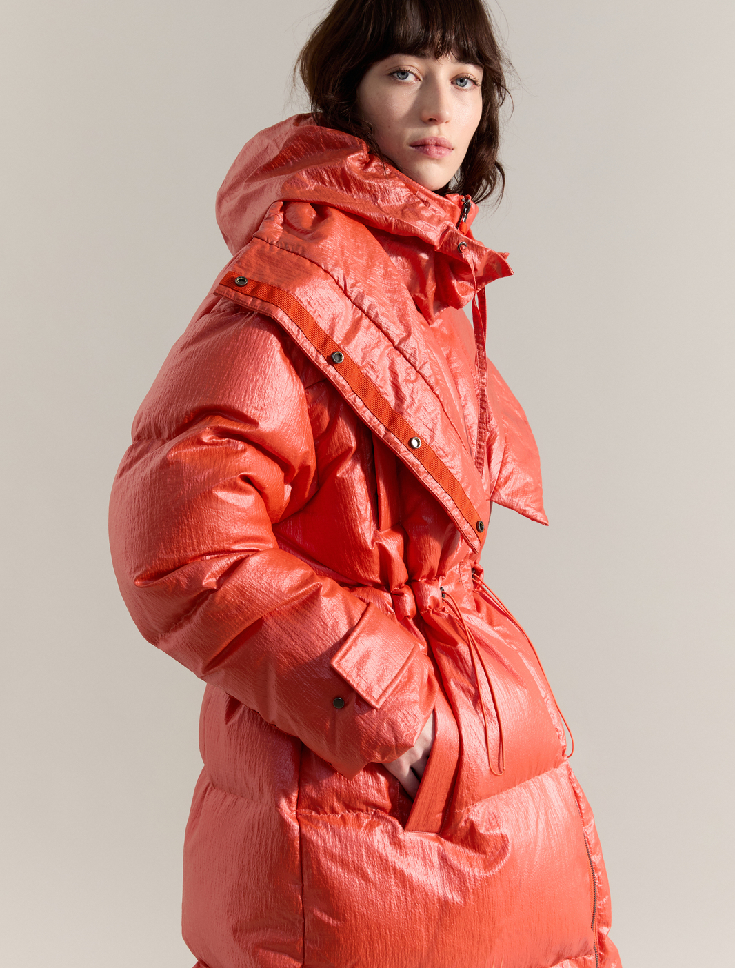 Outerwear headlines the collection. Drawstring-waist jackets, patch pocket mid-length anoraks and long coats come in water-repellent ripstop. Grosgrain details are both a practical reinforcement and an aesthetic flourish. Ultra-light and comfortable, maxi, zipped and recycled down or wadding-padded outerwear emphasises the collection’s innate duality.
