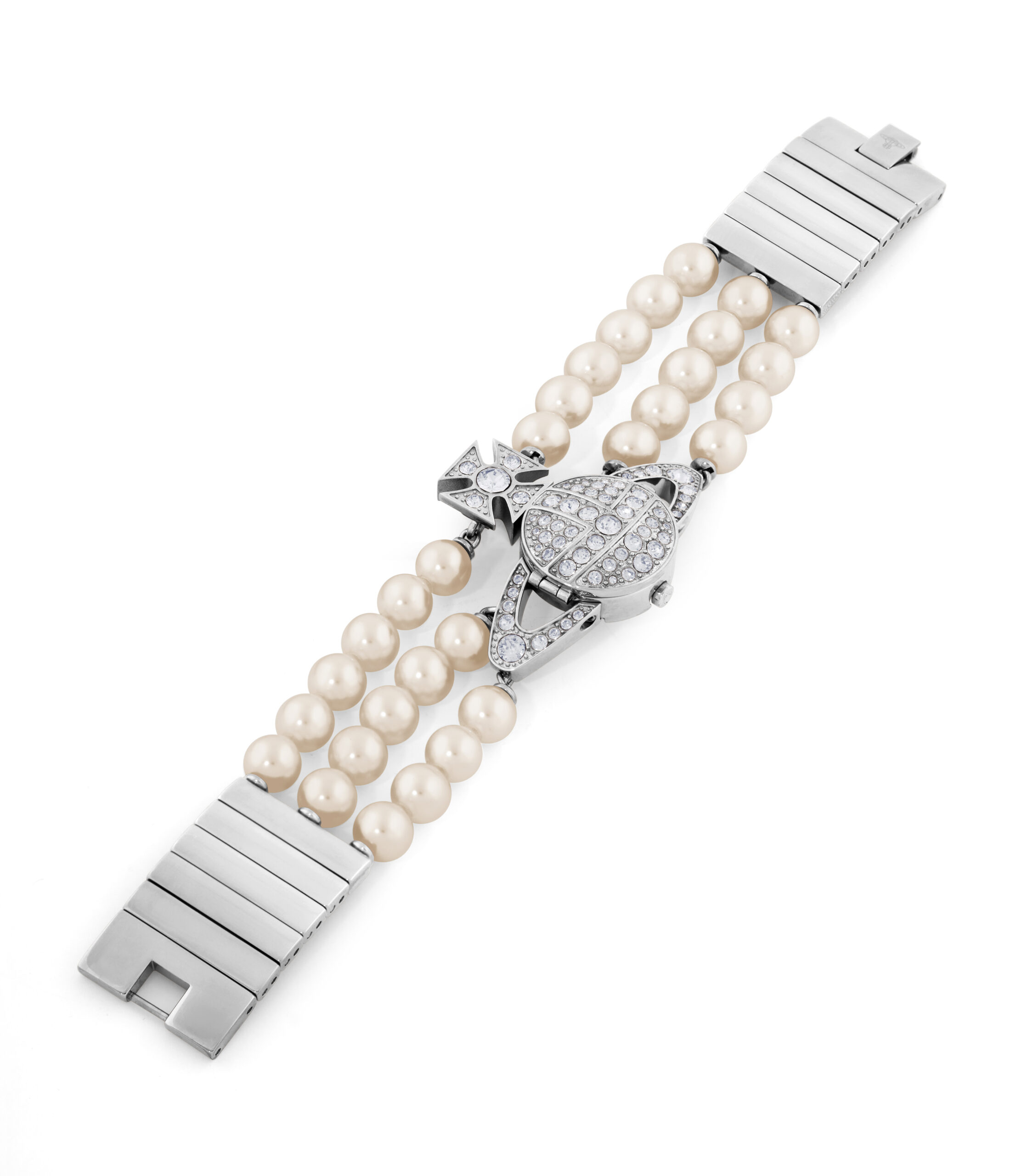 Vivienne Westwood launches a new silver plated version of the limited-edition Strand pearl watch. The exquisite timepiece draws inspiration from the iconic Three Row Pearl Bas Relief Choker, first showcased in the seminal Vivienne Westwood Autumn-Winter 1990/91 ‘Portrait’ collection. The Strand decorative watch is expertly crafted with three delicate rows of Swarovski glass pearls and central orb watch case, embellished with Swarovski crystals. The orb opens to reveal a delicate dial in satin sunray with specialist Swiss movement. This edition is finished with silver plated hardware.